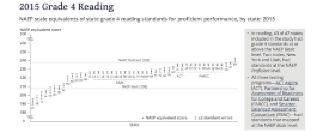 To set the stage for a debate on rigorous standards, researchers from NAEP recently looked at 47 states that participated in three nationally-administered exams: the ACT Aspire (ACT), the Partnership for Assessment of Readiness for College and Careers (PARCC) and the Smarter Balanced Assessment Consortium (SBAC). They then estimated NAEP equivalent scores for the exams and mapped the outcomes onto a graph depicting how their proficiency levels measured in comparison.